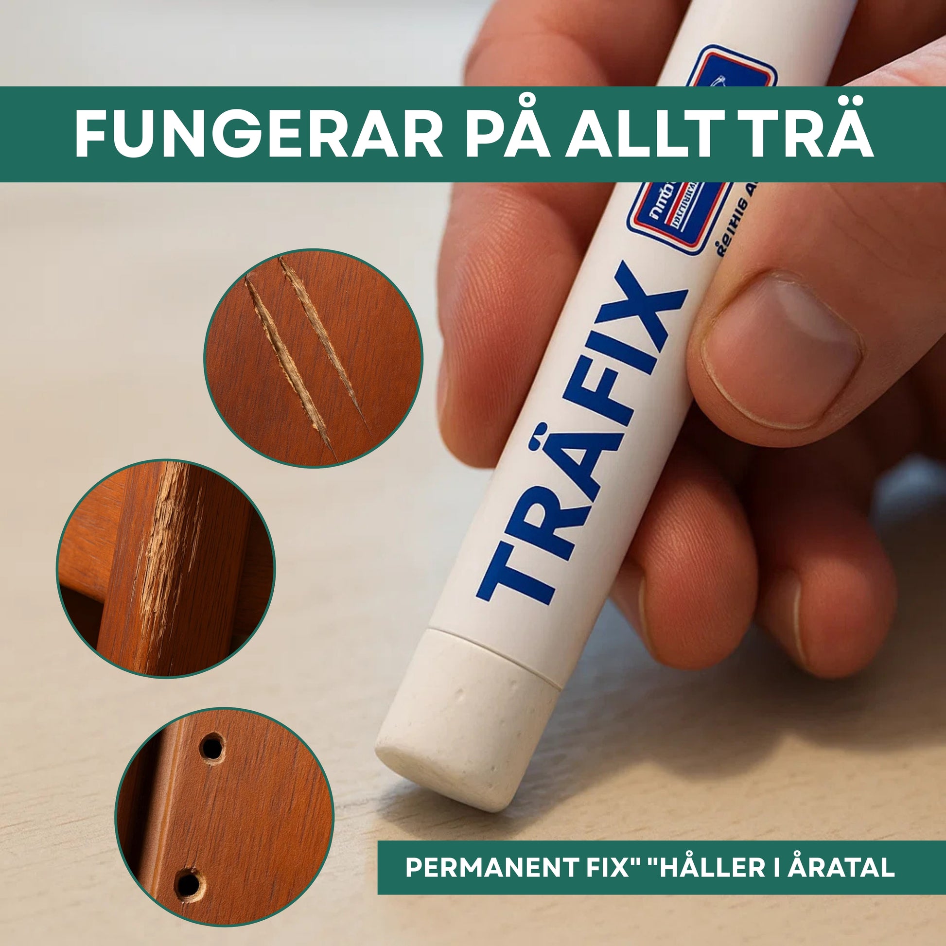 TräFix fixar reporna direkt, helt utan verktyg, lim eller annat krångel.